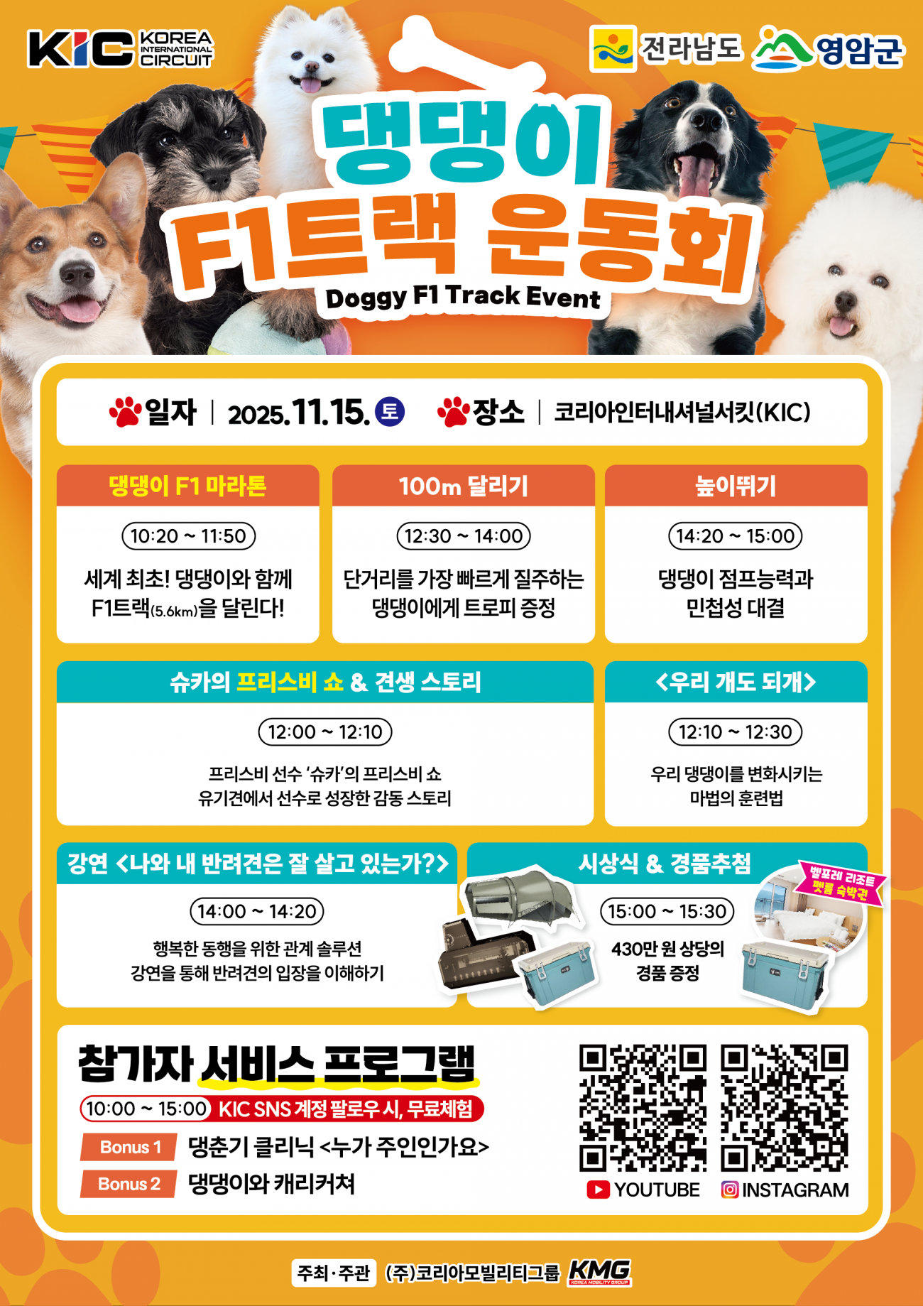 [노트펫] 전라남도는 국제자동차경주장 관리운영을 맡은 ㈜코리아모빌리티그룹이 오는 15일 반려문화 확산을 위해 반려견과 함께 F1트랙을 달리는 '2025 댕댕이 F1트랙 운동회'를 개최한다고 10일 밝혔다.