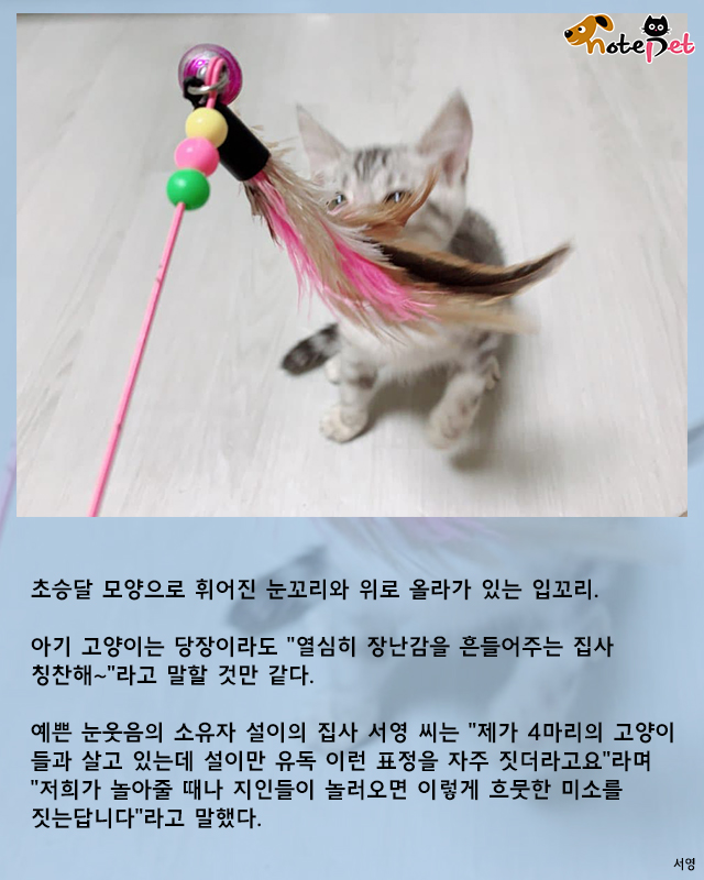 집사가 장난감으로 놀아주자 흐뭇한 미소 짓는 아깽이 최가은 기자 gan1216@inbnet.co.kr 작성일: 2019.11.05 09:00:00 3 0 가 이전 다음 1/6 [노트펫] 자신을 즐겁게 해주기 위해 열심히 장난감을 흔드는 집사를 보고 흐뭇한 미소를 짓는 아깽이의 모습이 웃음을 자아내고 있다. 최근 한 온라인 커뮤니티에는 '웃는 게 주특기예요'라는 글과 함께 사진이 올라왔다. ⓒ 반려동물 뉴스 노트펫, 무단전재 및 재배포 금지 URL복사 URL로 공유시 전체 선택하여 복사하세요. 닫기 3 목록