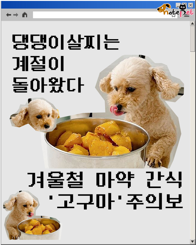또한 겨울이면 고구마를 너무 먹어 살이 쪄 동물병원을 찾는 강아지들이 많다는 썰이 인터넷상에서 돌아다닐 정도로, 고구마는 명실상부한 강아지의 겨울철 최애 간식 중 하나입니다.
