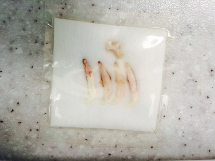 발치한 유치 송곳니 4개와 어금니 1개입니다.
