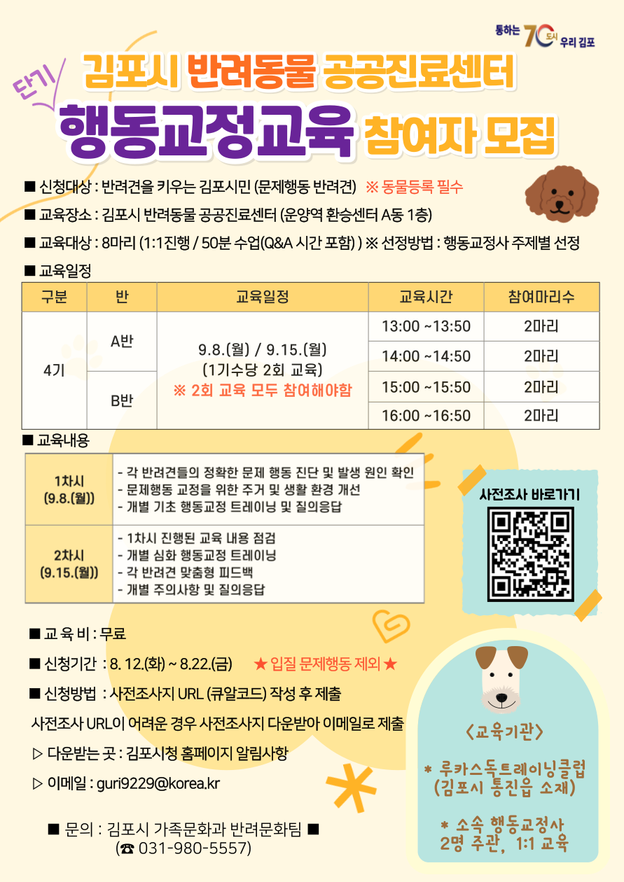 교육은 문제행동을 보이는 반려견을 키우는 김포 시민이라면 누구나 신청할 수 있다. 보다 효과적인 맞춤 교육을 위해 기수당 8마리 이내로 1:1 맞춤형 방식으로 진행된다. 신청 시 제출하는 사전 조사서를 바탕으로 반려견의 양육환경과 문제행동 유형을 분석한 후, 최종 교육 대상자를 선정할 예정이다.
