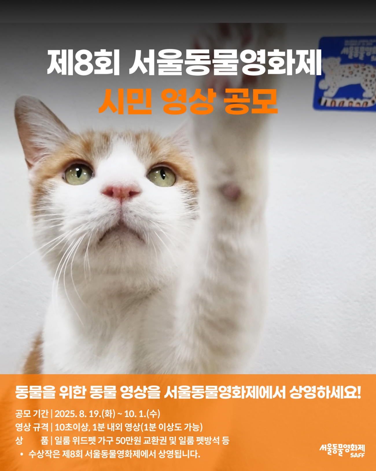 선정된 영상은 단편으로 엮여 제8회 서울동물영화제 폐막식과 온라인 상영관에서 공식 상영된다. 추후 서울동물영화제 유튜브에도 업로드된다. 수상작에는 일룸 위드펫 가구 교환권 및 일룸 펫방석, 기프티콘 등의 상품이 주어진다.
