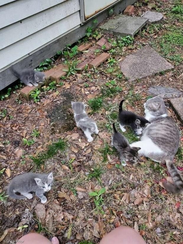그녀는 고양이 가족을 돕기로 했고, 모두를 안전한 집 안으로 데려왔다.