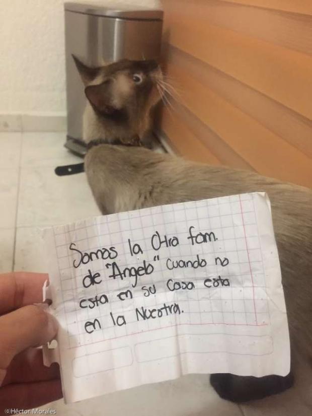 쪽지에는 "우리는 안젤로의 다른 가족이에요. 녀석이 당신 집에 없을 때는 우리 집에 있는 거예요"라고 적혀 있었다.
