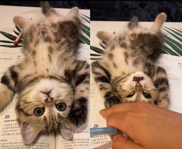 펼쳐놓은 책 위에 대자로 드러눕더니 치명적인 귀여움으로 방해하기 시작하는데.