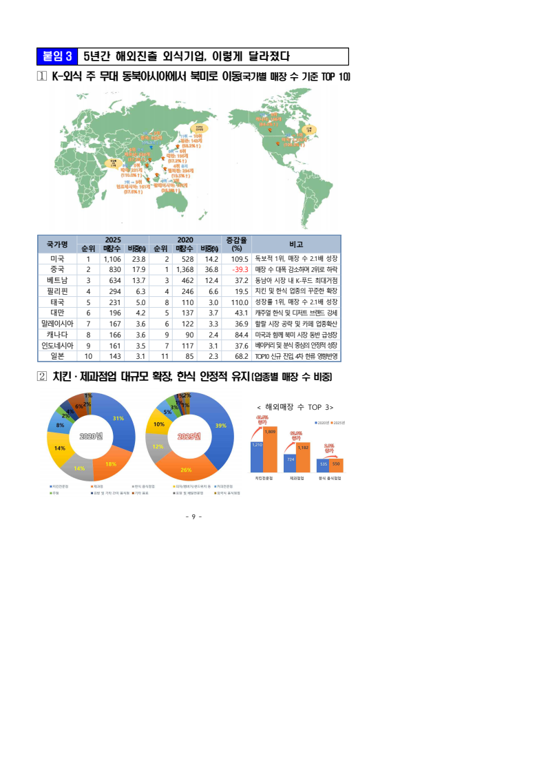 그 중 치킨(1,809개 매장)과 제과점(1,182개 매장)이 전체 해외매장의 약 64%를 차지하며 K-외식 성장의 양대 축임을 다시 한번 입증하였으며, 한식 음식점업(550개 매장)은 매장 수는 완만한 증가를 보였으나, 그 비중은 소폭 감소한 것으로 나타났으며, 커피전문점의 매장 수도 감소한 것으로 나타났다.