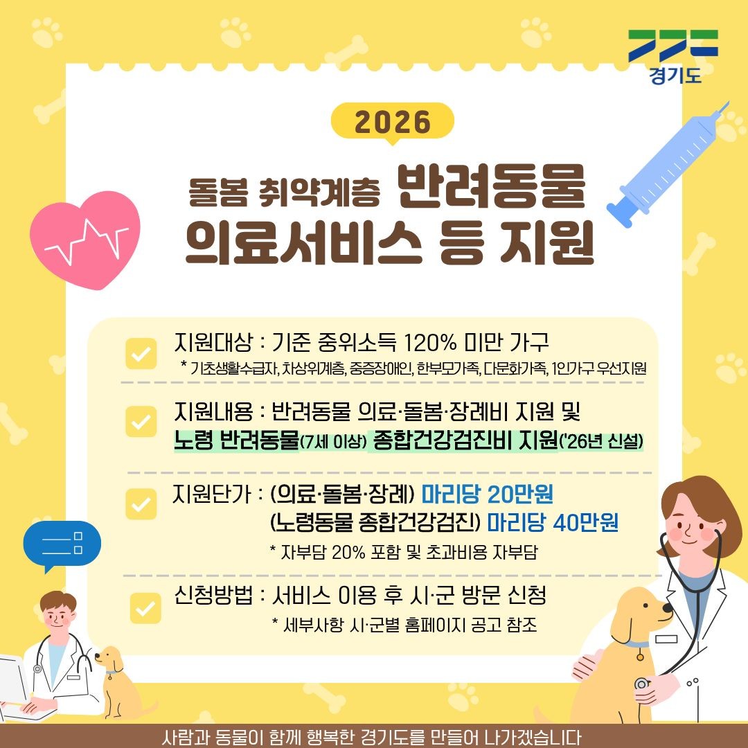 [노트펫] 경기도가 올해부터 기초생활수급자나 중증장애인 등 사회적 배려계층이 키우는 7세 이상 노령 반려동물에 대한 종합건강검진비를 지원한다.