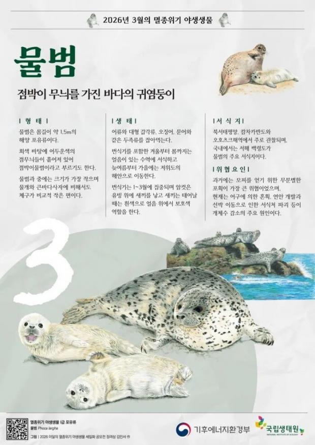 [노트펫] 기후에너지환경부(장관 김성환)는 봄이면 우리나라 백령도를 찾아오는 ‘물범’을 3월 ‘이달의 멸종위기 야생생물’로 선정했다고 2일 밝혔다.