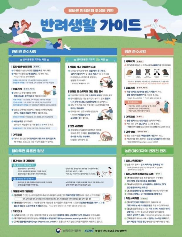 한편, 농식품부는 반려인-비반려인 준수사항, 들개 및 개물림 사고 대응요령, 관련 안내번호 및 홈페이지 등을 소개하는 ’올바른 반려문화 조성을 위한 반려생활 가이드‘ 홍보물 7만부를 배포하였고, 향후 동물보호센터 및 관련 영업자 등 대상으로 추가로 송부할 예정이다.