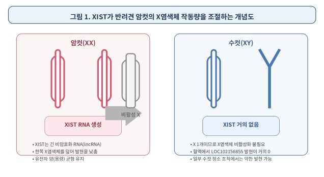 실제 분석 결과, 암컷 개의 혈액에서는 지스트(XIST)가 작동해 유전자 양을 조절하고 있지만, 수컷 개의 혈액에서는 거의 작동하지 않는다는 사실을 확인했다.