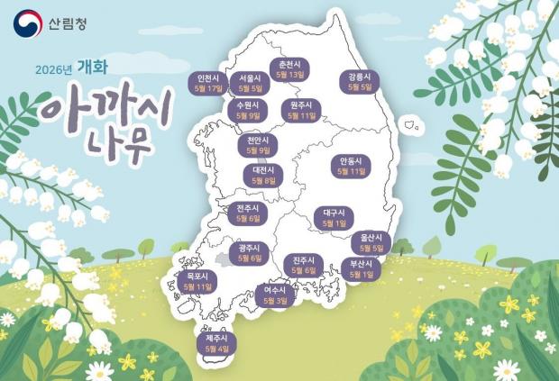 지난 겨울 기온이 평년보다 0.6℃ 높았고 4~5월 기온도 상승할 것으로 전망되면서, 올해 아까시나무와 마가목의 개화 시기는 전년보다 전국 평균 2~4일 앞당겨질 것으로 예상된다. 이번 개화 예측지도는 산림지역을 기준으로 작성돼 실제 개화 시기는 지역에 따라 차이가 나타날 수 있다.