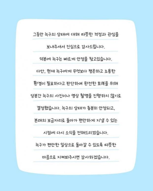 대전 오월드는 22일 홈페이지 공지 사항을 통해 "그동안 많은 분들께서 늑구의 상태에 대해 걱정과 관심을 보내주신 점 진심으로 감사드립니다. 덕분에 늑구는 빠르게 안정을 찾고 있습니다"라고 감사 인사를 전하고 "현재 늑구에게 무엇보다 평온하고 조용한 환경이 필요하다고 판단하여 완전한 회복을 위해 당분간 늑구의 사진이나 영상 촬영을 진행하지 않기로 결정했다"고 전했다.
