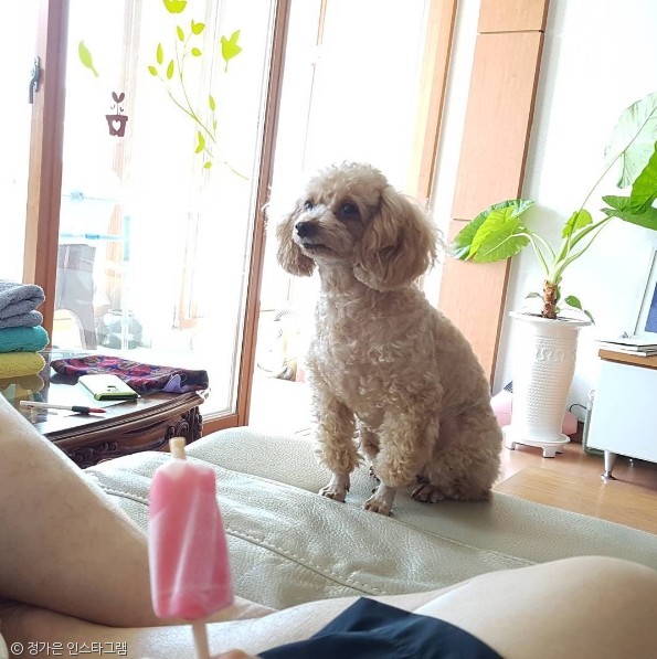 정가은은 사진과 함께 "아이스크림 먹는 아빠를 너무 애틋하게 쳐다보는 루비"라는 말을 덧붙였다.