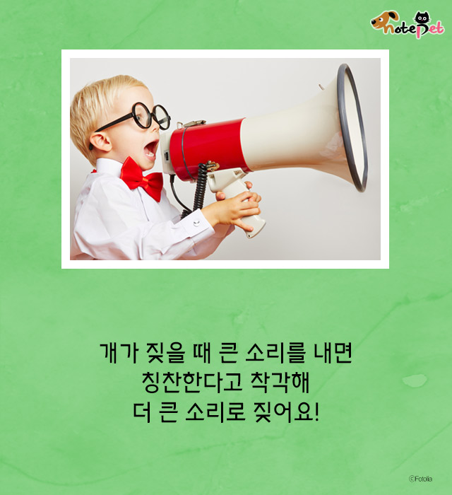 개가 짖을 때 큰 소리를 내면 칭찬한다고 착각해 더 큰 소리로 짖어요!