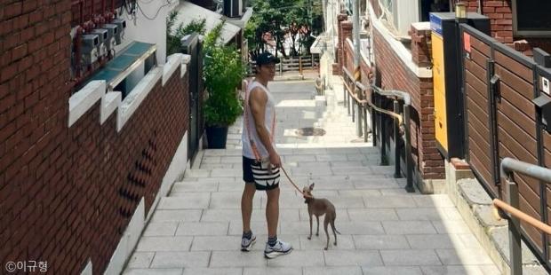 공개된 사진 속에서 이규형은 이탈리안 그레이하운드종으로 추정되는 강아지와 골목 산책을 즐기고 있다.