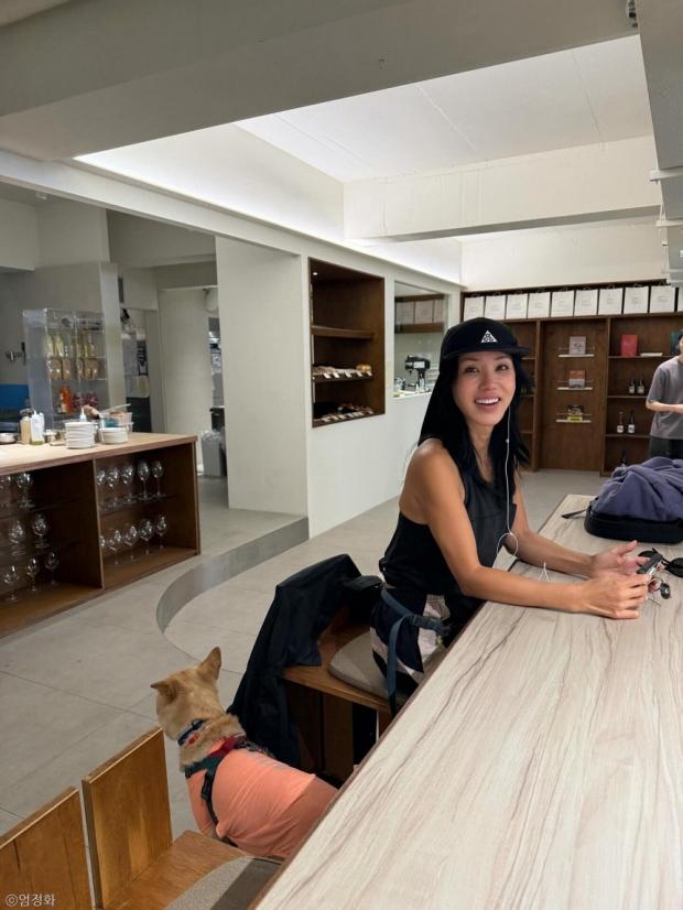 공개된 사진 속에서 엄정화는 둘만의 여유로운 산책을 즐기고 있다.
