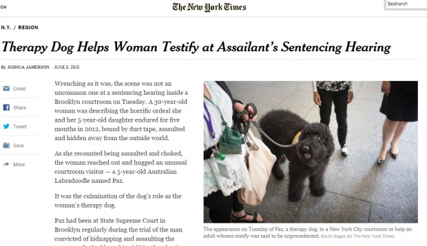 지금껏 뉴욕 법정에서는 어린 피해자가 법정에 설 경우 치료견을 데리고 입장한 사례는 몇 건 있었다. 하지만 성인 피해자의 경우는 그렇지 못했으나 이날만은 달랐다.