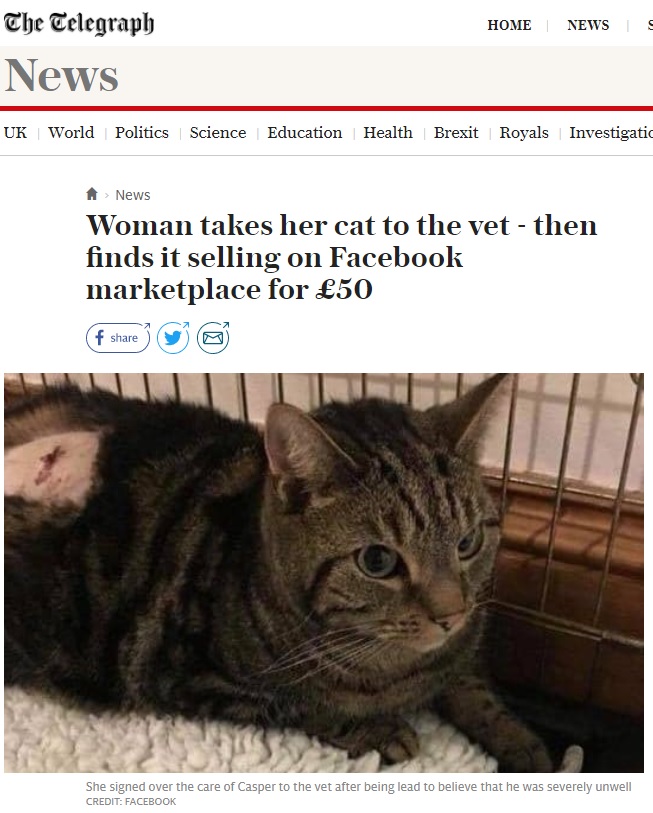 [노트펫] 아파서 수의사에게 맡긴 고양이가 페이스북에서 7만원에 판매됐다고 고양이 주인이 주장했다고 영국 일간지 텔레그래프가 지난 17일(현지시간) 보도했다.