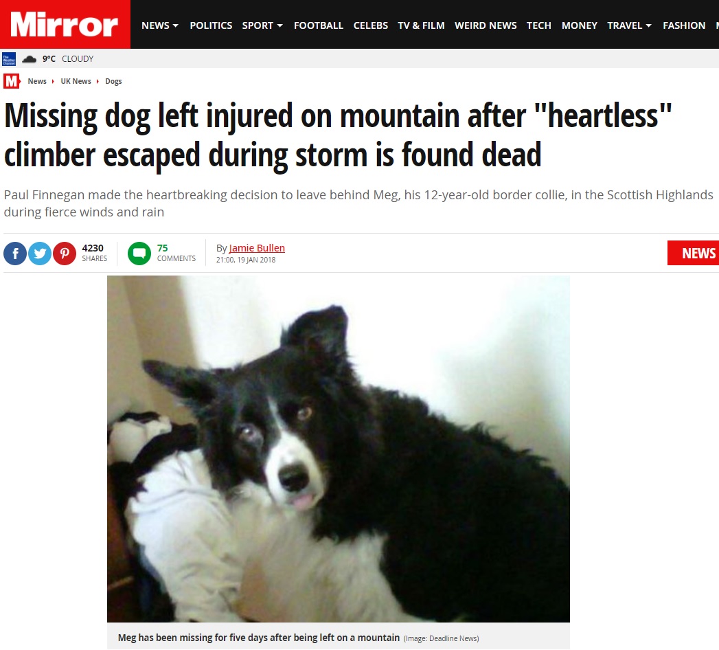 견주 폴 피네건은 지난 14일 영국 스코틀랜드 빈 스걸래어드 산에 12살 된 보더콜리 반려견 ‘메그’를 데리고 올라갔다. 거센 폭풍우가 몰려오자, 피네건은 메그를 남겨두고 홀로 하산하는 결정을 내렸다. 다리를 다친 반려견과 같이 하산하긴 불가능하다고 판단한 것.