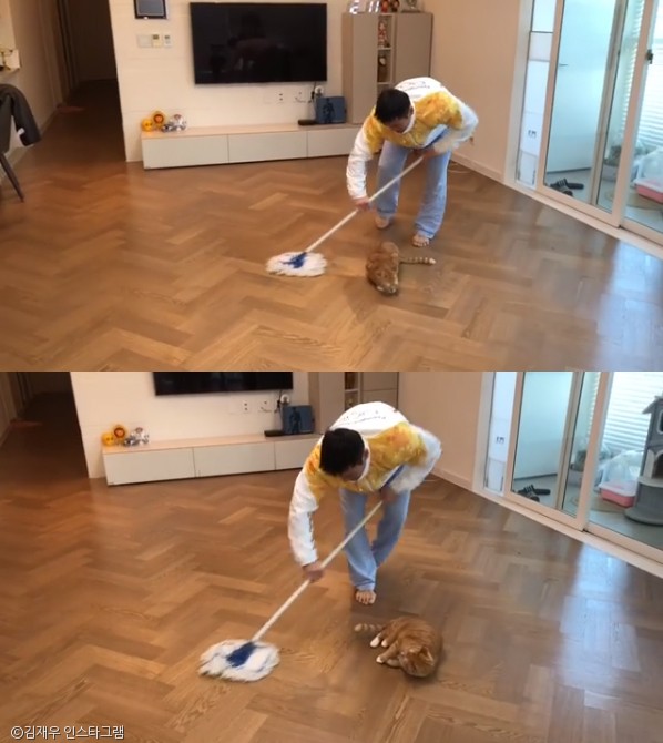 공개된 영상에는 김재우가 대걸레를 밀면 앞으로 조금씩 이동하는 드라곤의 모습이 담겼습니다.
