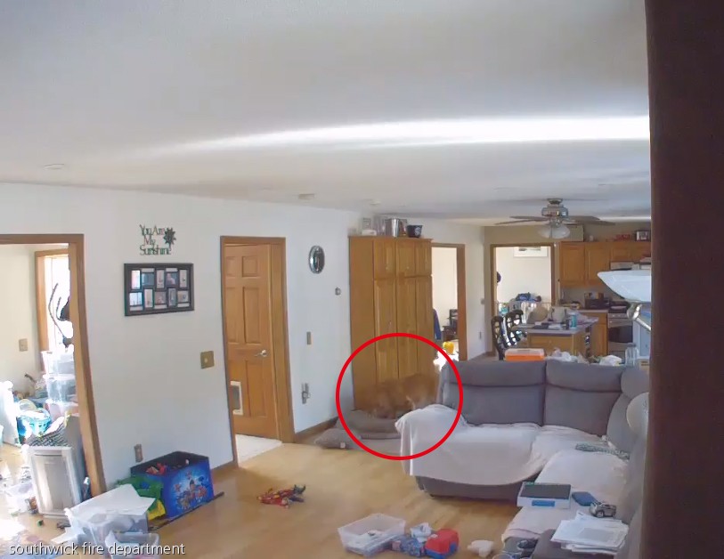 이에 놀란 리트리버들은 어찌할 줄을 몰라 집안을 이리저리 오가지만 딱히 할 수 있는 일은 없습니다. 오히려 집밖으로 나가는 것을 포기한 채 소파 위에서 불이 난 주방을 우두커니 지켜볼 뿐입니다.