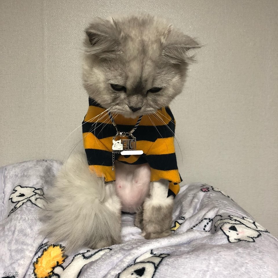 하필 새로 갈아입힌 옷이 노출(?)이 있는 옷이라 배만 뽈록 나와있는 게 냥무룩한 자세와 묘하게 어울려 지흠 씨는 그 모습을 놓치지 않고 사진으로 남길 수밖에 없었다고 한다.
