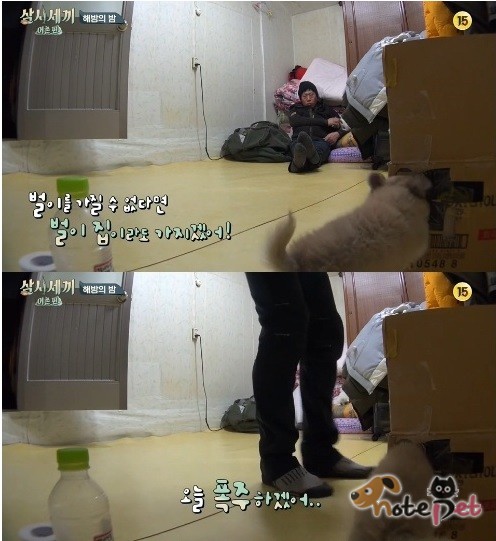 지난달 27일 방송된 tvN '삼시세끼-어촌편' 6화에서 고양이 벌이를 한 시도 가만히 두지 않는 강아지 산체의 모습이 보여졌다.