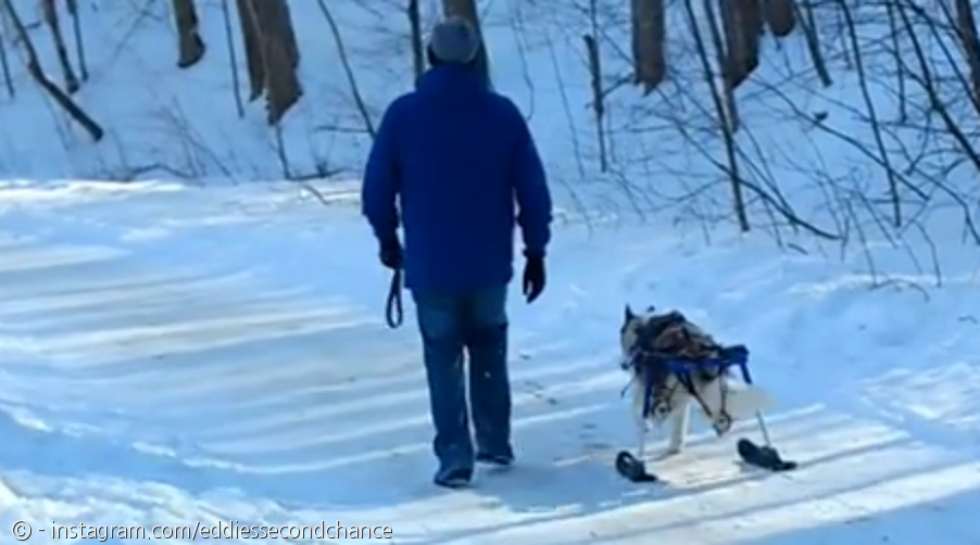에디는 뒷다리를 쓰지 못하는 파커를 위해 강아지용 휠체어를 선물했다.
