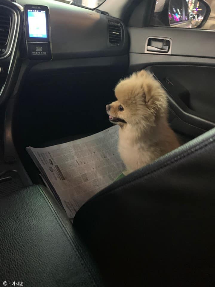 그런데 신문지가 깔려 있는 조수석에 귀여움의 대명사 포메라니안이 염전히 앉아서 기사님을 향해 무한애정의 눈빛을 발사하고 있는 중이다.