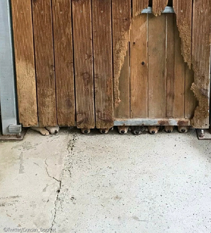 보호소에서 함께 시간을 보내는 분이 퇴근을 하자 아쉬운 마음에 한 줄로 서서 문틈으로 지켜보고 있던 것.