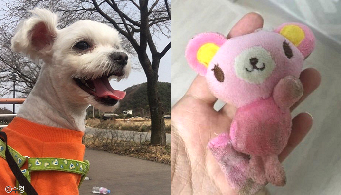 강아지가 몰래 넣어뒀던 선물은 분홍색 곰인형. 평소 강아지가 가장 아끼고 좋아하던 애착인형이었다.