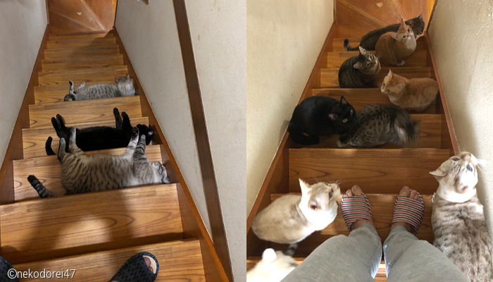 그런 그에게는 하나의 고충이 있는데, 바로 고양이들 때문에 2층 침실에서 1층 거실로 내려가는 계단을 이용하는데 어려움이 있다는 점.