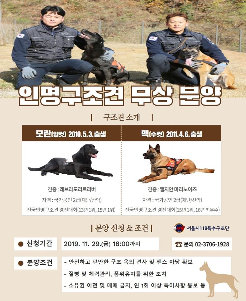 [노트펫] 서울시119특수구조단이 은퇴 예정인 인명구조견 모란과 맥의 새주인을 찾고 있다.