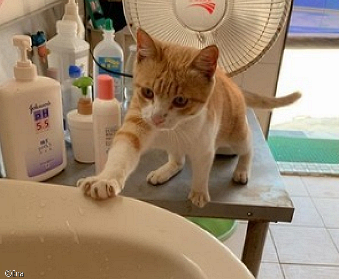 어느 날 아침, 세수를 하던 에나는 바로 옆에서 '야옹' 하는 소리를 들었다.
