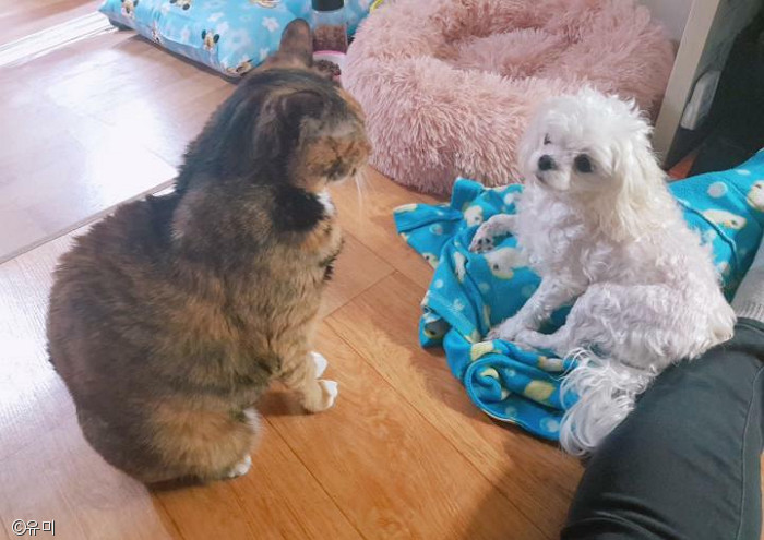 처음에는 냐옹이가 싫어할까 봐 걱정을 많이 했는데 조금 경계를 하더니 쿨하게 가족으로 받아줬단다.