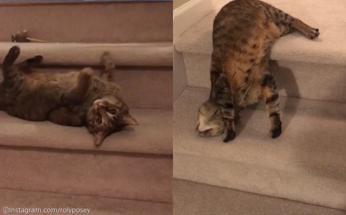 계단 '굴러' 내려가는 게으름뱅이 고양이 포착.."다 귀찮다냥~"