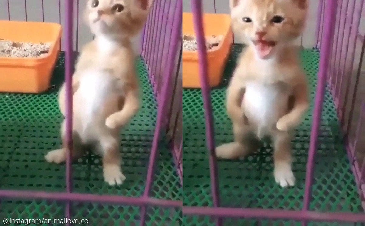 [노트펫] 마치 항의라도 하듯 자리에서 두 발로 일어나 울고 있는 새끼 고양이의 모습이 웃음을 자아내고 있다.