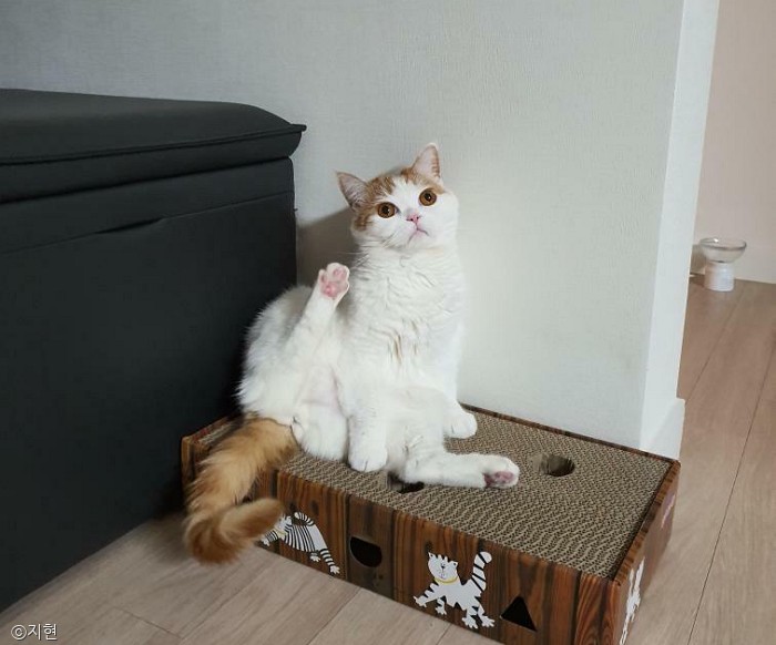 캣타워 꼭대기에서 가족들을 예의주시하다가 자신에게 관심을 안 보인다 싶으면 비장의 무기를 꺼낸다는데.