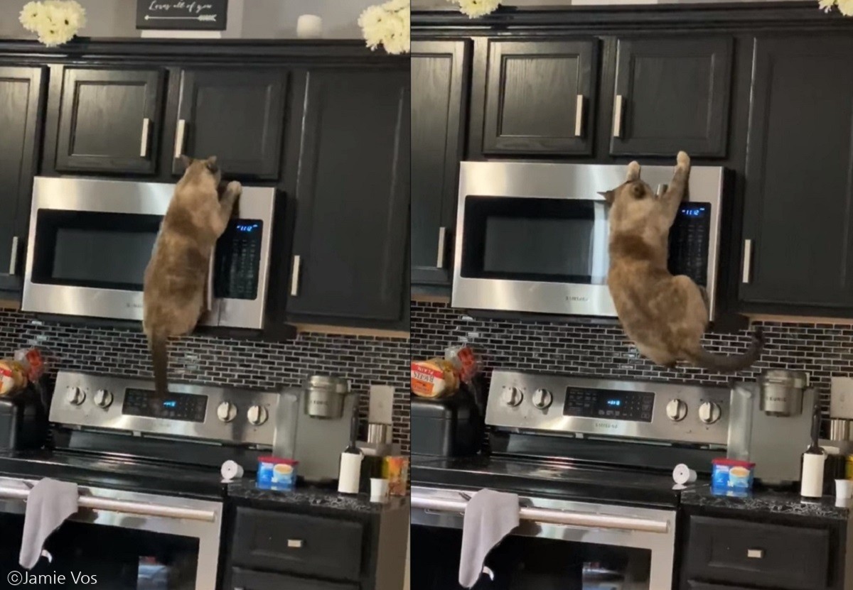 어디든 오르고 보는 사고뭉치 고양이, 전자레인지 등반하다 떨어져 체면 구겨