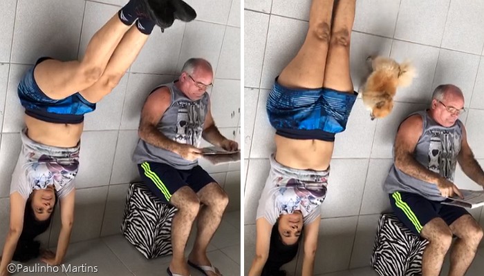 [노트펫] 진지한 표정으로 물구나무 묘기 영상을 촬영 중인 주인을 본 강아지는 천진난만한 얼굴로 사뿐사뿐 걸어가 모든 것이 거짓이었음을 알려줬다.
