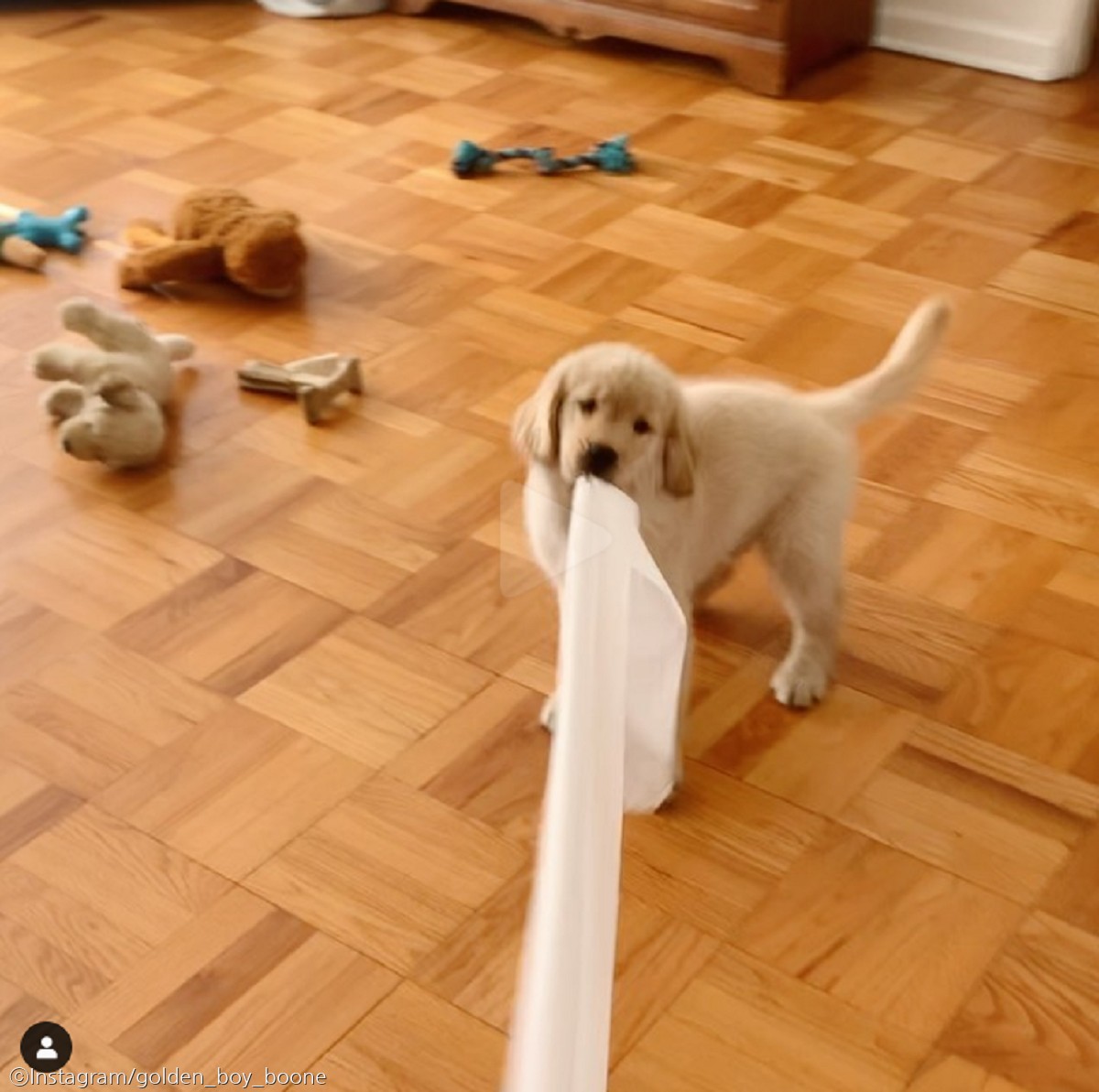 지난 10일 인스타그램 계정@goldenretrievershub에 올라온 영상 속에서 분은 화장실 휴지걸이에 걸려있는 두루마리 화장지를 입에 물고 방으로 향하고 있다.