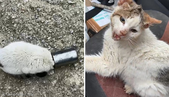 [노트펫] 배가 너무 고팠던 고양이는 빈 깡통에서 나는 냄새에 이끌려 머리를 넣었다 옴짝달싹 못 하는 신세가 됐다. 이를 본 남성은 주저하지 않고 녀석을 도왔다.