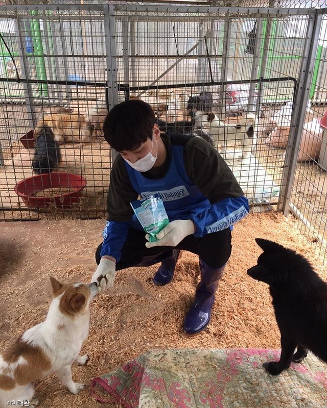 이태환은 마스크와 장갑을 착용한 채 유기견들에게 간식을 주고 있는 모습이다.