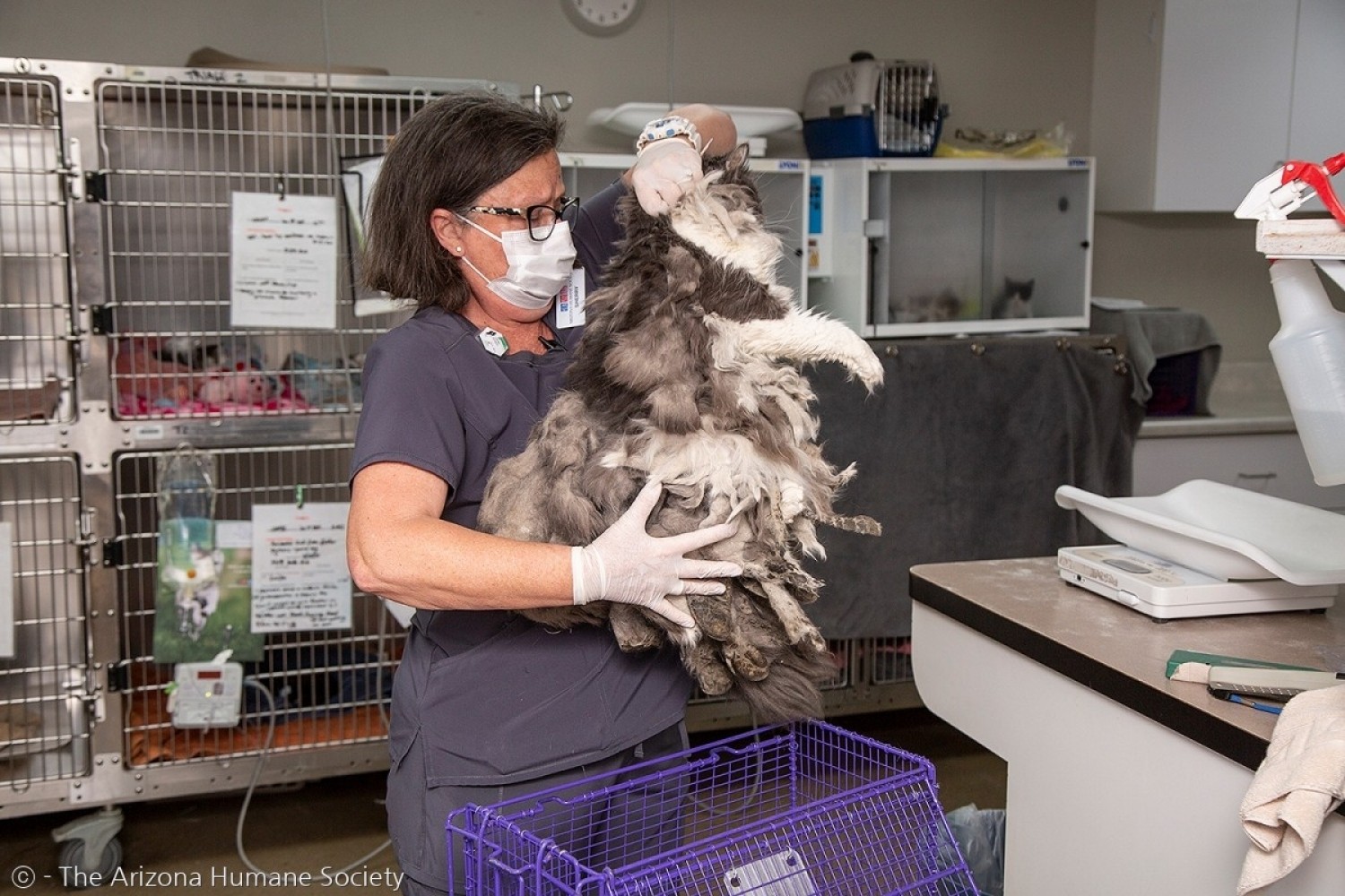미국 애리조나 휴메인 소사이어티(AHS)가 지난 22일 신고를 받고 동물을 구조했는데, 개인지 고양이인지 알 수 없었다. 털이 길게 자라서 뭉친 탓에 정체를 알아볼 수 없었기 때문이다.