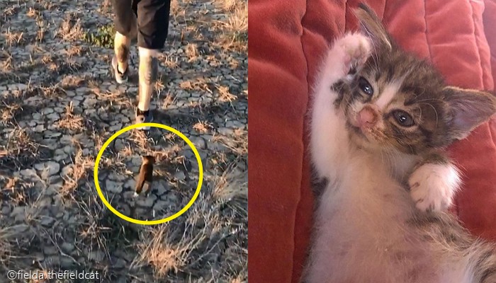 [노트펫] 홀로 허허벌판을 헤매고 다니던 아기 길냥이는 한 커플과 눈을 마주친 뒤 졸졸 쫓아다니기 시작했다.