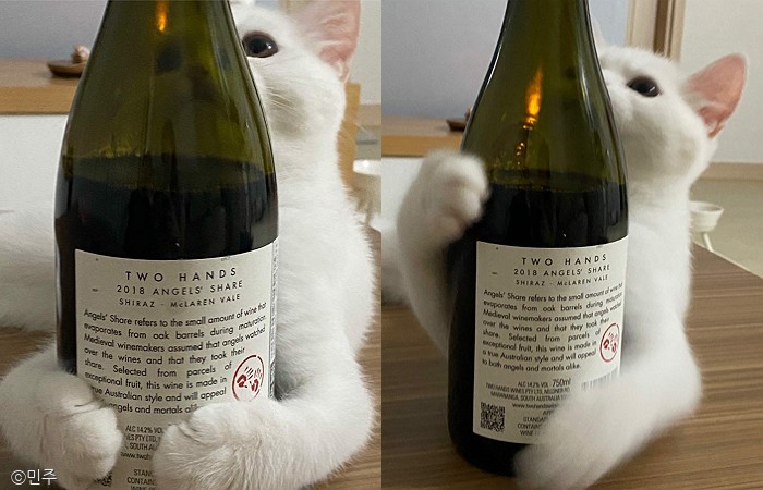 [민주 씨 : 보통 밥 먹을 땐 상 위로 못 올라오게 하는데 이날은 안 돼 정도만 하고 그냥 뒀어요. 그랬더니 와인병을 꼭 끌어안고 있더라고요. 너무 귀여워서 사진을 여러 장 찍었답니다.]