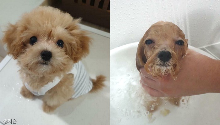 솜사탕 같던 털이 물에 닿아 녹으니 더욱 또렷하게 보이는 호두의 표정.
