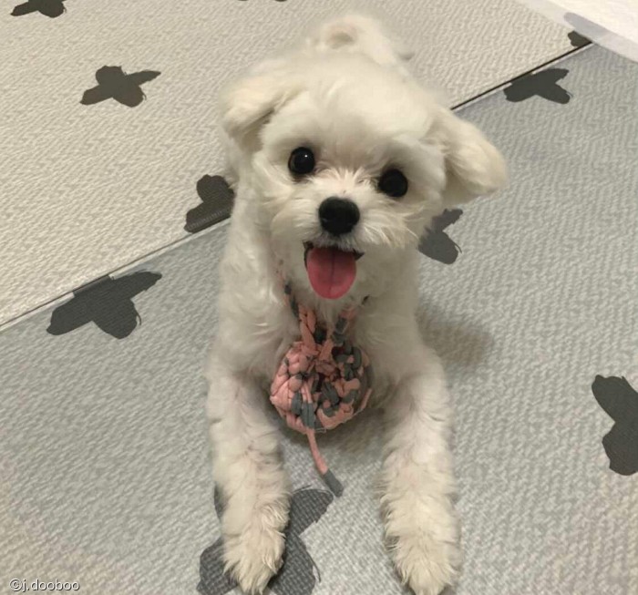 "평소에도 장난감만 집으면 던져달라고 왕왕 짖고 뛸 준비를 하는 에너지 넘치는 멍멍이에요"라고 두부를 소개한 JB 씨.