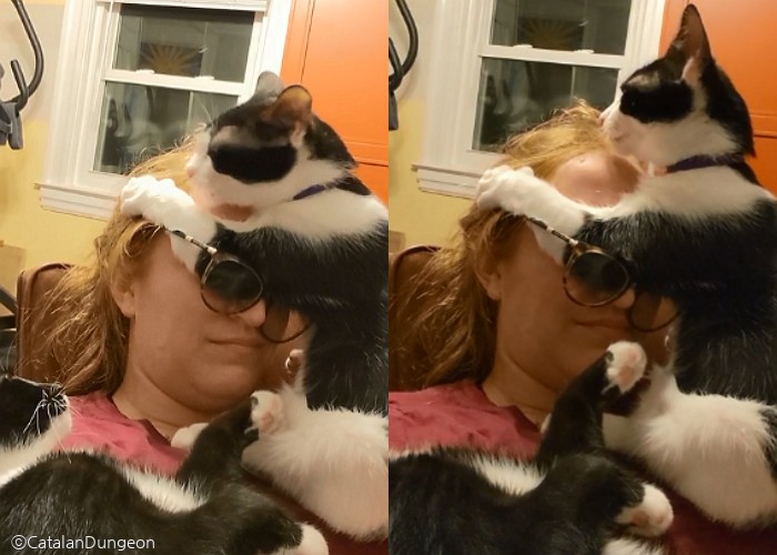 어깨에 앉은 냥이는 집사의 얼굴을 두 앞 발로 꼭 껴안더니 이마부터 머리까지 열정적으로 그루밍을 해줬다.