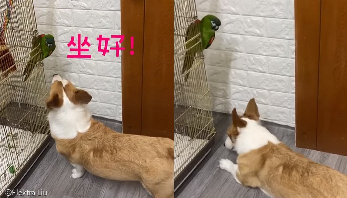 [노트펫] 꼬리를 흔들며 달려와 놀자고 보채는 웰시코기를 본 앵무새는 단호하게 "앉아!"라고 말했다. 그러자 강아지는 놀랍게도 녀석의 말을 들으며 놀아줄 때까지 얌전히 기다렸다.